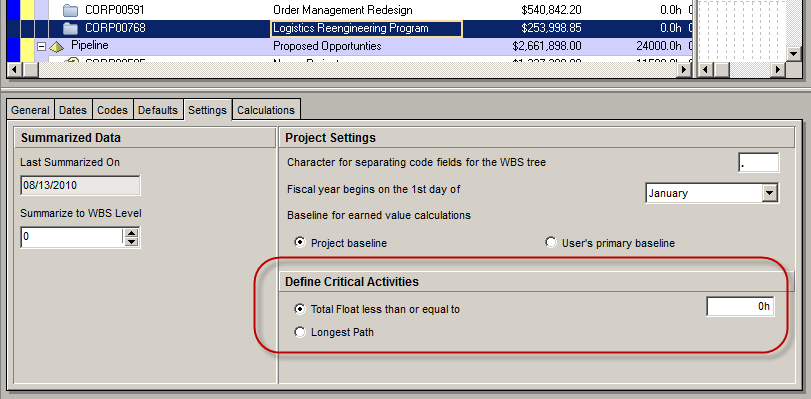 在这里,你选择Total Float小于或等于[value In hours]或使用最长路径。