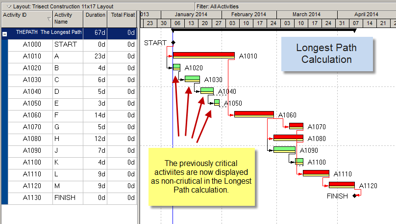 以前的关键活动现在显示为非关键活动。有趣的是,它们仍然有零天的Total Float,但是P6忽略了它们,因为它们不是通过网络的最长路径的一部分。
