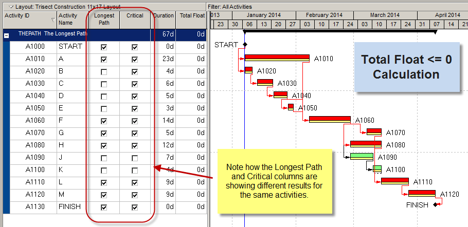 下面的示例显示了当使用Total Float方法计算关键路径时,关键路径是如何出现的。活动A1050有一个“Finish On or Before”约束,它等于它的计划完成日期,所以它和它的前辈显示关键。如果他们错过了,他们可能不会影响项目的结束日期,但他们将超出他们的约束日期;这就是为什么从' Total Float <= 0 '的角度显示它们是关键的。
