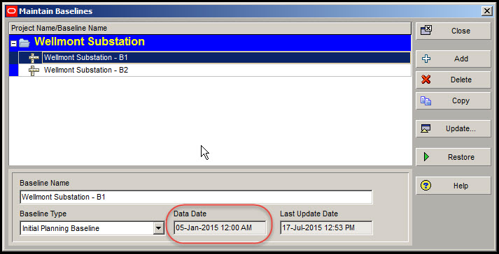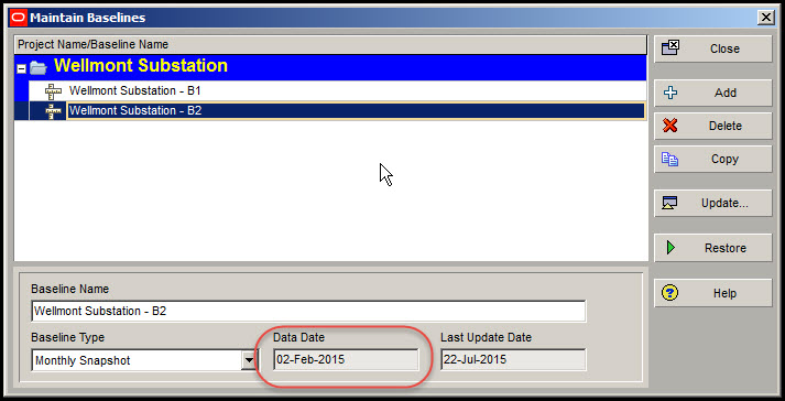 另外,请注意,Wellmont变电站的基线类型- B2被设置为每月快照。如果你没有这个基线类型,转到Admin | Admin Categories。在“管理类别”对话框中选择基线类型。点击+ Add, Primavera P6将创建一个新的基线类型,您可以将其命名为“月度快照”。
