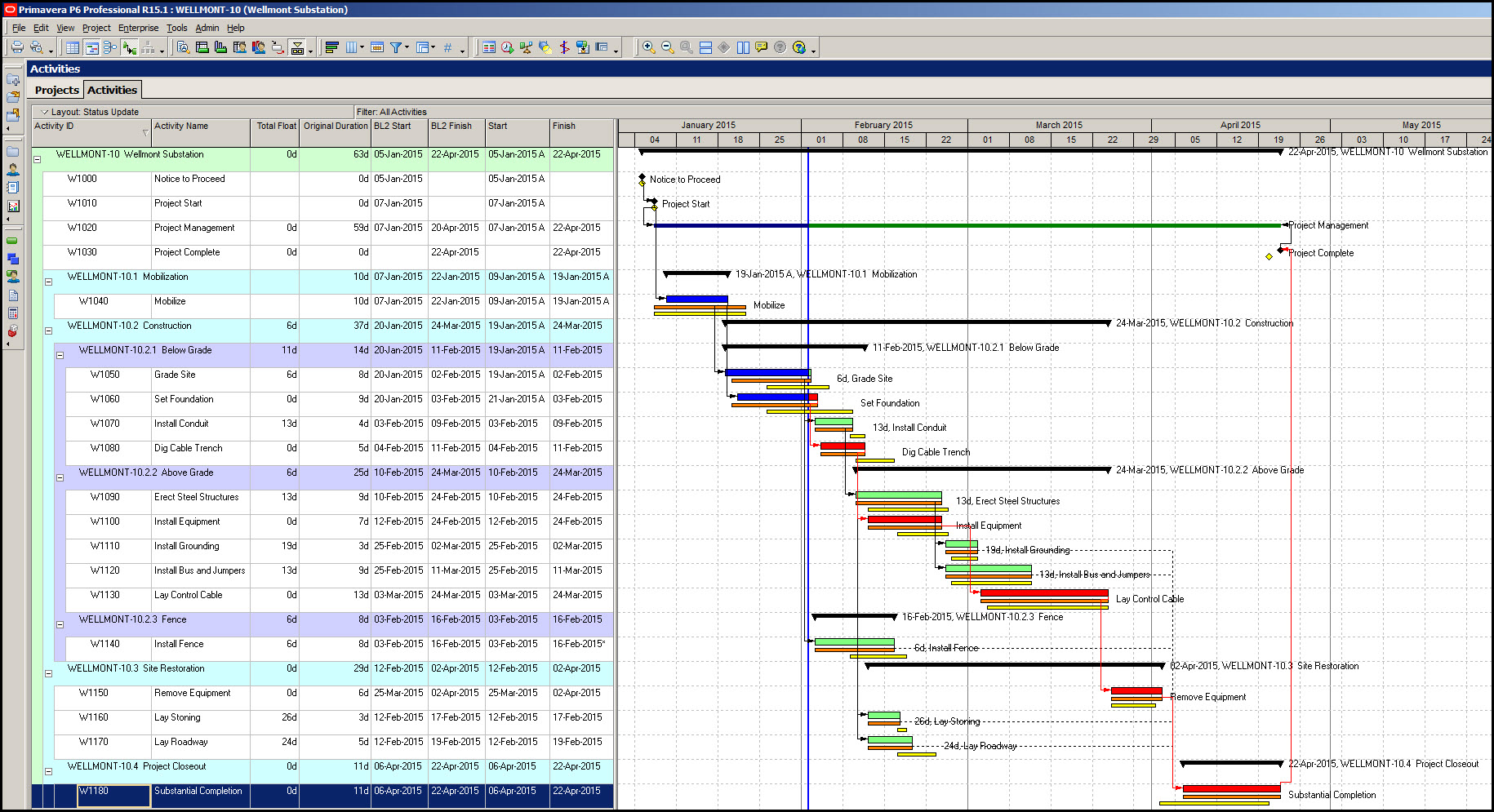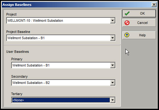 现在我们要分配我们的基线。要分配基线,请选择项目|分配基线。在分配基线对话框中,如图3,我们将项目基线设置为Wellmont变电站- B1,将主要基线设置为Wellmont变电站- B1,并将次要基线设置为Wellmont变电站- B2。