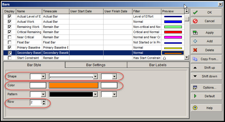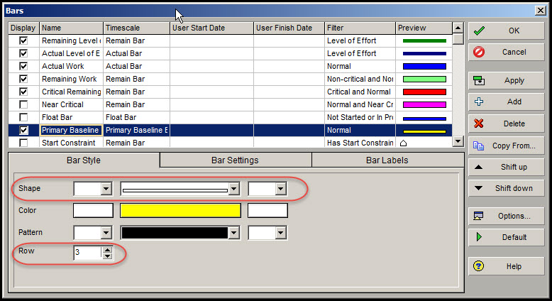 在Bar对话框的底部框架中选择Bar Style选项卡。适当调整主基线条的形状。同样,在Bar Style选项卡中将Row设置为3。因此,我们的基本基线相当于项目基线,将显示在第三行,最下面一行。